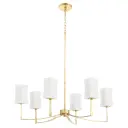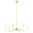 The Ayala chandelier combines clean architectural lines with soft curves, featuring six symmetrical arms extending from a central hub. Satin opal glass shades provide warm, diffused light while the gold leaf finish adds luxurious warmth to contemporary and transitional spaces.