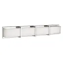 Elegant LED vanity with rectangular frosted glass with fine clear edges; polished chrome metal details with two metal bands which extend across the gl...