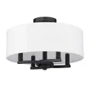The Eliana 4-light semi-flush mount combines industrial style with transitional warmth through its matte black frame and soft white fabric shade. Damp-rated for versatility, it delivers diffused ambient lighting perfect for modern to traditional spaces.