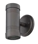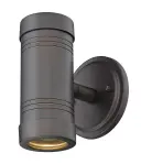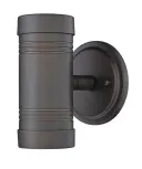 This sleek 2-light wall sconce features cast aluminum construction with an architectural bronze finish. Compact at 5" high and 6.5" wide, it delivers focused illumination through dual MR16 cylinders, ideal for modern outdoor spaces.