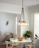 The Rumi chandelier brings contemporary sophistication with its clear seedy glass globes and luxurious lacquered brass finish. Perfect for intimate dining spaces or cozy rooms needing a modern focal point.
