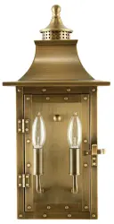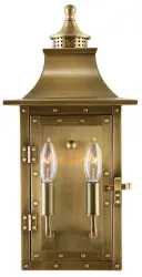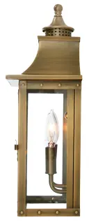The St. Charles 2-Light Wall Sconce combines solid brass construction with flat glass panels for a traditional outdoor lighting solution. Its aged brass finish and durable materials make it ideal for coastal and traditional homes.