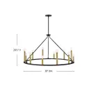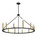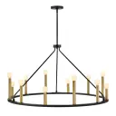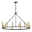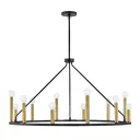 The Lazlo chandelier delivers contemporary sophistication with its streamlined Black frame and Lacquered Brass candle sleeves. At 38 inches wide, this statement piece bridges modern lodge and urban loft aesthetics effortlessly.