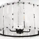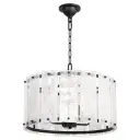 The Prestige pendant makes a bold architectural statement with its clear alabaster glass panels that resemble chiseled ice. The angular matte black frame and rectangular glass design create dramatic visual interest while diffusing light beautifully.