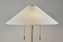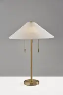 The Claremont Table Lamp combines timeless brass sophistication with practical dual-bulb functionality. Its tapered off-white fabric shade and vintage pull-chain switches create a perfect blend of traditional charm and modern convenience.