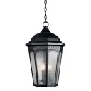 The Courtyard 3-Light Outdoor Hanging Light combines traditional design with durable outdoor construction. Its textured black finish and clear seeded glass create warm, inviting illumination for covered outdoor spaces.