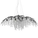 The Autumn Twilight chandelier transforms spaces with its organic branch design and cascading crystals. Hand-forged metal branches create a nature-inspired silhouette while crystal droplets add glamorous sparkle. The black iron finish provides bold contrast, making this 40-inch wide statement piece perfect for grand dining rooms and foyers.