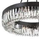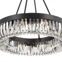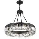 The Alister chandelier makes a bold statement with hand-cut crystal shapes positioned around a charcoal bronze frame. Its linear design and uniform internal lighting create stunning crystal brilliance, perfect for modern dining spaces.