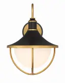 The Atlas Outdoor Sconce combines modern aesthetics with classic charm through its distinctive matte black and gold finish. The bowl-shaped white glass diffuser paired with gold-arched rods creates an elegant focal point for any exterior space.