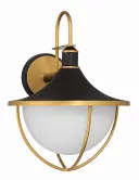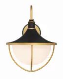 The Atlas Outdoor Sconce combines modern aesthetics with classic charm through its distinctive two-tone matte black and gold finish. The bowl-shaped white glass diffuser and gold-arched rods create visual interest while providing functional outdoor lighting.