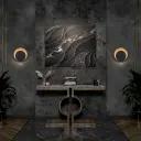 The Eclipse LED Wall Sconce combines striking visual artistry with practical outdoor lighting. Its moon-eclipse design creates a captivating backlit effect while integrated downlighting provides functional illumination.