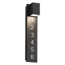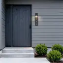 The Bishop 26" Wall Sconce combines strong architectural lines with a timeless modern profile. Its substantial size and Sand Black finish make a striking statement on exterior walls, while optional light grey numbers add personalized character.