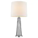 The Chiara table lamp combines polished chrome with steel and glass construction, topped with an off-white shantung shade. At 29 inches tall, it provides substantial presence with a 3-way rotary switch for adjustable lighting.