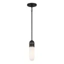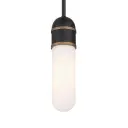 The Capsule Mini Pendant by Brian Patrick Flynn combines futuristic aesthetics with industrial edge. Its distinctive two-tone finish and capsule-shaped white glass create dramatic light effects in compact spaces.