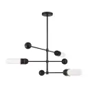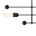 The Capsule Linear Chandelier by Brian Patrick Flynn combines mid-century aesthetics with industrial edge. Its distinctive capsule-shaped white glass and two-tone finish create dramatic visual interest perfect for modern spaces.