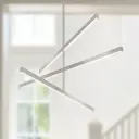 The Vega chandelier features adjustable linear LED lights that can be configured at different heights and angles, creating a distinctive sculptural presence. Its 45-inch span and warm integrated LED make it ideal for modern dining rooms and living spaces.
