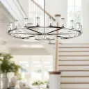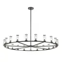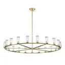 The Revolve 61-inch chandelier combines timeless elegance with transitional style, featuring clear glass tubes accented with metal rings around a striking brass body. Perfect for large dining rooms and grand foyers.