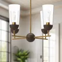 The Emil chandelier beautifully blends natural walnut wood with aged gold metallic accents, creating a versatile fixture that transitions seamlessly from modern Scandinavian to rustic cottage aesthetics. At 25 inches, it's perfectly sized for medium spaces.