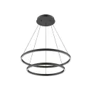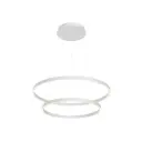The Cerchio chandelier features a sophisticated dual-ring design in extruded aluminum with a brushed gold finish. Integrated 3000K LED provides warm ambient lighting both upward and downward through flush silicone diffusers.