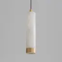 The Aragon mini pendant combines natural carved Spanish alabaster with plated gold accents for an upscale, sophisticated look. Its compact 9-inch cylindrical form conceals a high-powered LED source, delivering 600 lumens of warm 3000K light. Damp-rated for bathroom use, this fixture brings luxury to intimate spaces.