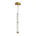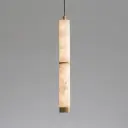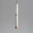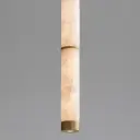 The Aragon mini pendant combines natural carved Spanish alabaster with plated gold accents for an upscale, sophisticated look. Its compact cylindrical form conceals a high-powered LED source, delivering 1000 lumens of warm 3000K light. Damp-rated for bathroom use, this fixture brings luxury to intimate spaces.