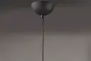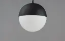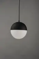 The Half Moon pendant combines geometric simplicity with functional lighting. Its spun metal semi-sphere cap in matte black pairs beautifully with a satin white glass shade, creating soft, even illumination perfect for task and ambient lighting.