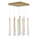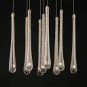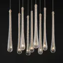 The Stillo 9-Light Pendant showcases hand-blown bubble glass in elongated teardrop forms with plated gold metalwork. Dense glass walls create visual impact while energy-efficient LED G4 lamps provide warm illumination from within each shade.