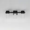 The Dram bath vanity combines sleek modern design with practical functionality. Dual cylinder glass shades diffuse LED light beautifully while black powder coat finish adds contemporary sophistication to any bathroom.