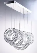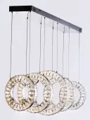 The Charm Linear Pendant features descending beveled crystal rings suspended on cables, creating a dramatic floating effect. With 4540 lumens of warm LED light and polished chrome accents, this fixture delivers both brilliant illumination and sculptural beauty.