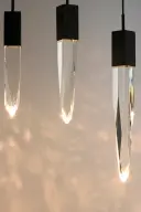 The Quartz pendant transforms spaces with its spectacular array of beveled crystal stalactites suspended at varying heights. High-CRI LED modules illuminate the faceted crystals, creating mesmerizing light diffusion and sparkle.