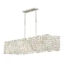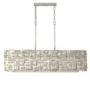 The Farrah linear chandelier combines bold contemporary design with refined craftsmanship. Hand-hammered crosshatch metalwork in Silver Leaf finish creates visual texture while maintaining an airy presence, complemented by White Linen shades for sophisticated modern elegance.
