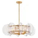 The Seraphina chandelier combines opulent textured water glass with a distressed brass frame, creating sophisticated light diffusion and varied refractions. Its versatile drum silhouette bridges modern and traditional aesthetics.