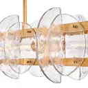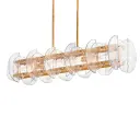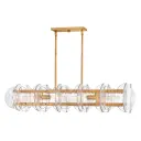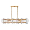 The Seraphina linear chandelier combines opulent water glass panes with a distressed brass frame for sophisticated illumination. Its 48-inch length and transitional design make it versatile for both modern and traditional interiors.