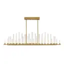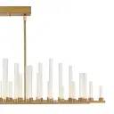 The Trinity Medium Linear creates a breathtaking focal point with 50 integrated LED lights arranged in undulating frosted glass columns along Heritage Brass bars. This 48-inch statement piece combines old-world candle inspiration with modern LED technology for spectacular visual impact.