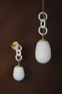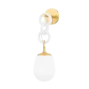 The Marina Wall Sconce brings artisanal charm with its chunky textured white rings and aged brass accents. Inspired by jewelry design, the interlocking rings and hooked metal details create a sophisticated floating effect.