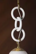 The Marina Pendant combines artisanal charm with refined elegance through chunky textured white ceramic rings and aged brass accents. Its jewelry-inspired design creates a sophisticated focal point with a unique floating shade effect.