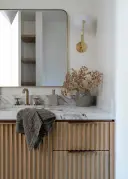 The Hattie Wall Sconce combines architectural elegance with functional beauty. Its diagrammatic aged brass arm and textured white convex shade create visual interest both lit and unlit, while casting a gentle glow and wall reflection when illuminated.