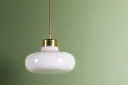 Add a modern retro sensibility to the ceiling with this rounded blown opal glossy glass shade capped by a ring of Aged Brass. The soft shape and clean...