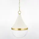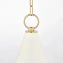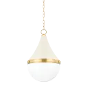 The Ciara Pendant reimagines classic nautical design with a contemporary teardrop silhouette. Aged brass hardware and beveled band details add industrial sophistication to the soft cream conical shade and opal glass diffuser.