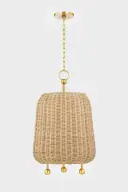 The Elena Pendant combines tightly woven natural wicker with aged brass accents for a sophisticated organic look. Its basket weave form adds warmth and texture while the metal detailing elevates the design beyond typical natural fiber fixtures.