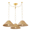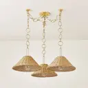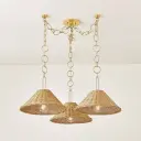 The Dalia Chandelier beautifully blends natural rattan wicker with refined aged brass metalwork, creating a sophisticated yet relaxed aesthetic. Its tapered shade adds visual interest while the warm brass finish provides vintage charm.