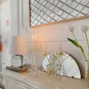The Nicole table lamp combines sophisticated crystal craftsmanship with modern functionality. Its ridged, ripple-cut crystal base creates stunning light refraction, while the white linen shade provides soft, diffused illumination.