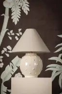 The Annabelle table lamp combines whimsical polka dot texture with sophisticated ivory ceramic and natural linen. Part of the Ariel Okin collaboration, it balances fun design elements with versatile neutral tones.
