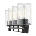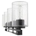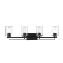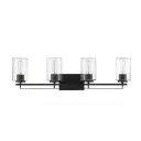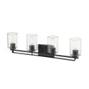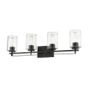 The Orella 4-Light Sconce combines industrial matte black steel with clear seeded glass shades for a striking bathroom statement. At 31.5" wide, it provides ample illumination for larger vanities while adding vintage character.