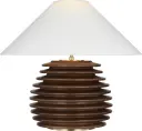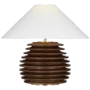 The Crenelle table lamp features a distinctive stacked wood construction in burnished birch, creating architectural interest with natural texture. The 20-inch height and linen shade provide warm, diffused lighting ideal for living spaces.