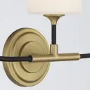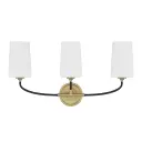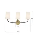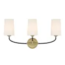 The Niles vanity light blends contemporary and industrial design with graceful upward-lifting arms and tapered white glass shades. Black forged metal frame with modern gold accents creates versatile appeal for various decor styles.