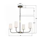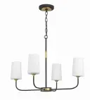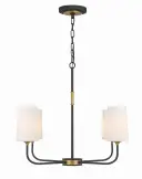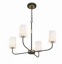 The Niles chandelier blends contemporary and industrial design with graceful upward-lifting arms and tapered white glass shades. Black forged metal frame with gold accents creates versatile appeal across multiple decor styles.