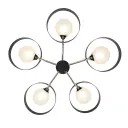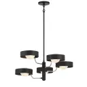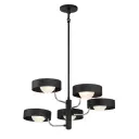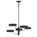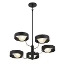 The Lift Off chandelier combines industrial-inspired coal black with polished nickel accents for a sophisticated modern look. Five G9 bulbs provide ample illumination through glass shades, perfect for dining areas and kitchen islands.