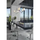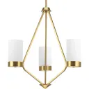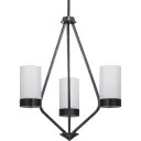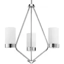 The Elevate chandelier brings sophisticated mid-century style with three etched white glass shades and polished chrome finish. Perfect for intimate dining spaces and breakfast nooks, offering soft, diffused light with JA8 compliance.