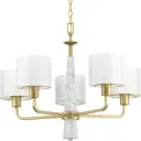 The Palacio chandelier brings sophisticated elegance with five white silk fabric shades and vintage gold finish. Perfect for creating a warm, inviting ambiance in dining rooms and bedrooms with traditional or transitional décor.